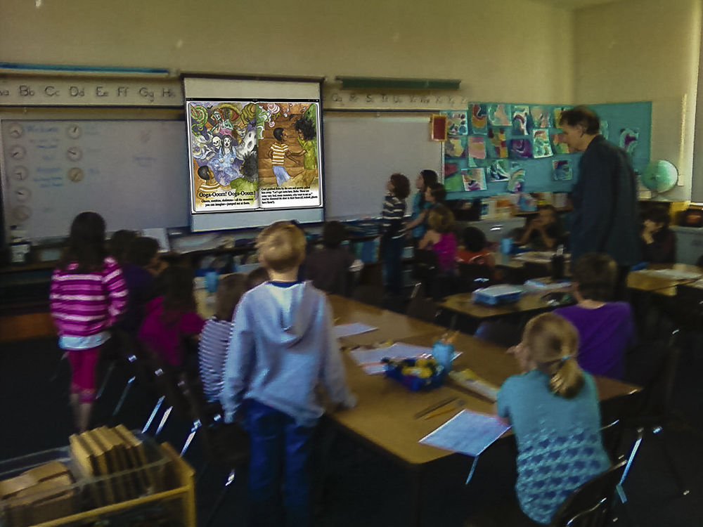 In May 2012, just before the end of the school year, author JJ Semple used Halloween Ooga-Ooga-Ooum as a pedagogical tool in a three phase classroom reading lesson. As you can see in the photo above, this 2nd. grade class is completely engaged as the book "reads itself." But is that all there is to it? Bring in some audio-visual equipment and an eBook, and have the book read itself? Hardly!